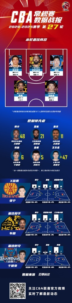 数据领先者方面:四川蓝鲸篮球俱乐部球员艾德蒙以单场48分的数据领衔得分榜;