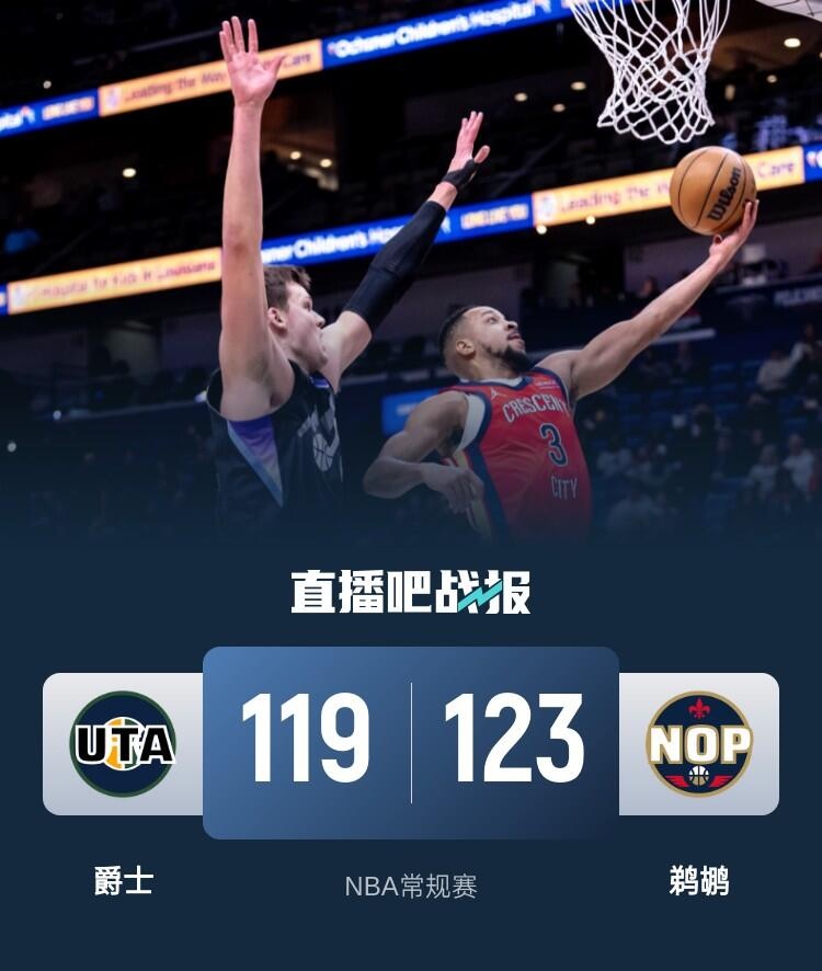此役一上来爵士便反客为主,开局轰出14-0攻击波确立优势,鹈鹕状态低迷单节仅得到19分,爵士气势如虹早早拉开比分,首节结束时爵士已经领先19分,次节回来,鹈鹕找到进攻节奏,穆雷联手麦科勒姆率队追分,但爵士多点开花牢牢占优,半场战罢,爵士依然领先20分。易边再战后场上形势风云突变,穆雷连投带罚延续火力,鹈鹕回敬17-3进攻高潮,三节结束后鹈鹕追至7分,末节上来,麦科勒姆里突外投不断取分,鹈鹕延续势头抹平分差,决胜时刻麦科勒姆上篮绝平,科利尔抛投未果进入加时,麦科勒姆火力不减予取予求,墨菲飚中三分后两罚全中,最终鹈鹕123-119击败爵士上演25分大逆转。
