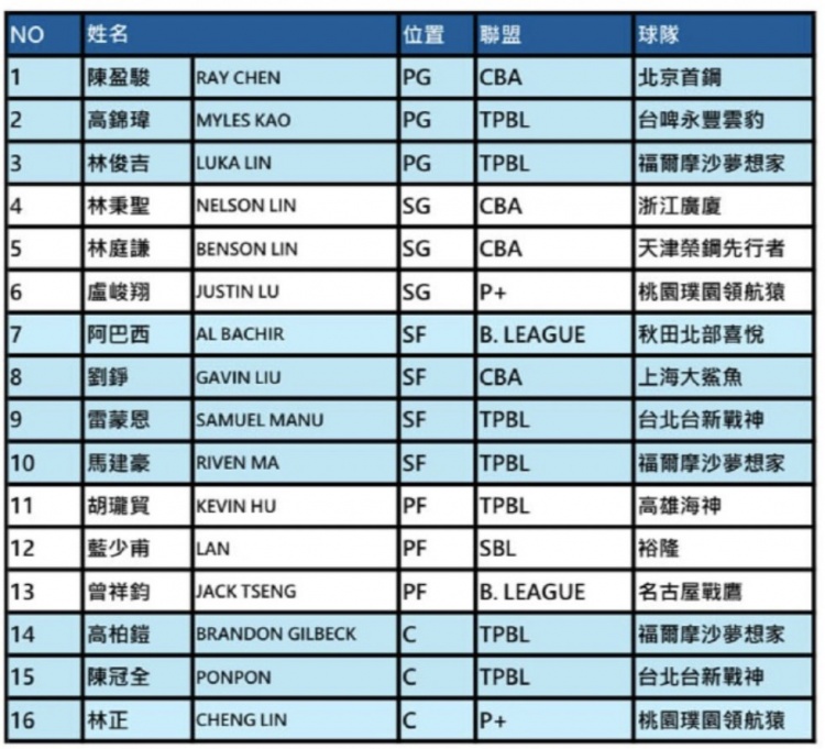 2月3日讯 今日,中国台北男篮公布亚预赛集训名单,CBA四名球员入选。