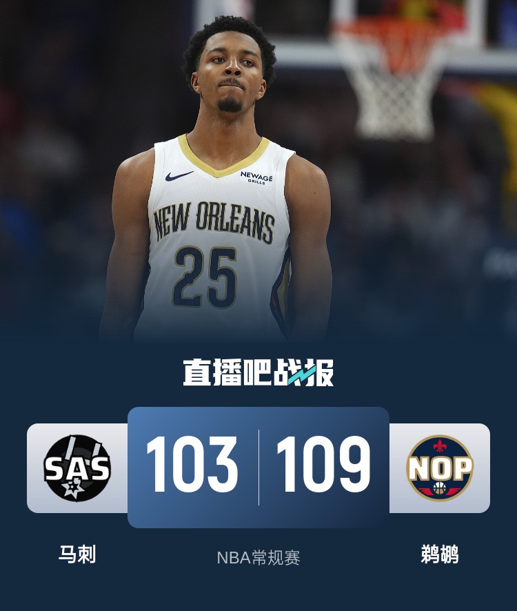 开场后巴恩斯手感火热外线不断命中三分,福克斯也接连杀入内线拿分,他们带领马刺半节时间打出23-8的攻势建立领先,随后阿尔瓦拉多连续拿分为鹈鹕咬住比分。第二节鹈鹕不断冲击内线追分,马刺三分手感依旧不错,布朗突然爆发带领鹈鹕掀起一波反扑将比分追上,期间墨菲也是连中三分。易边再战,瓦塞尔接连砍分帮助马刺巩固优势,鹈鹕则是不断冲击篮筐紧追不舍,两队你来我往大打对攻战,末节决战中鹈鹕上来就先将比分反超,锡安在内线强势发挥,瓦塞尔和福克斯连中三分为马刺夺回领先,但鹈鹕连续冲击内线又将比分反超,此后马刺进攻连续不中,墨菲一度崴脚好在没有大碍,保罗关键三分为马刺续命,但随后福克斯出现失误,最终鹈鹕109-103逆转三天内两胜马刺,马刺遭遇3连败。