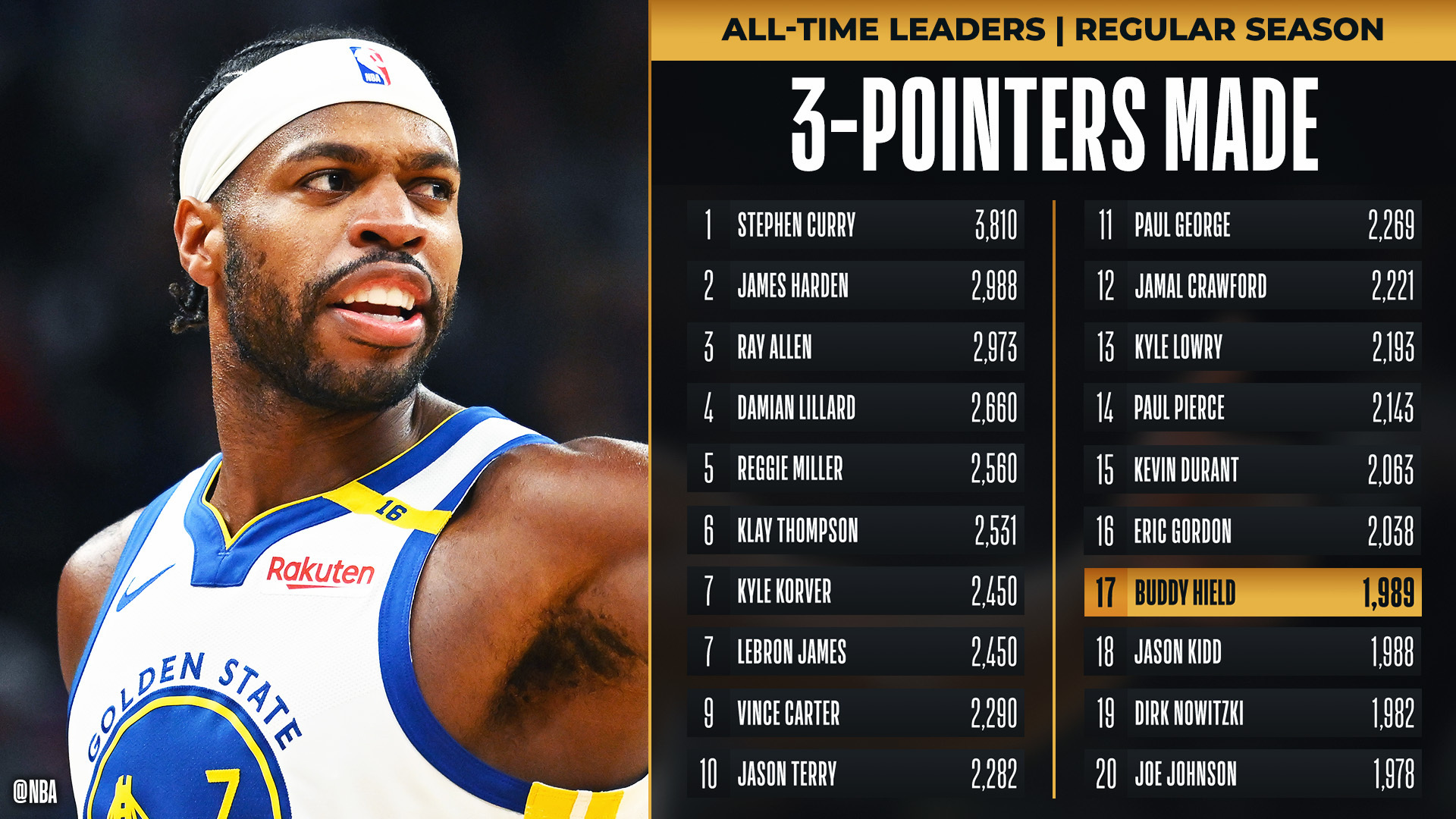 本场比赛,勇士射手希尔德投进2记三分,NBA生涯三分命中数来到1989记,超越基德升至历史第17,前面一位是埃里克-戈登(2038记)。