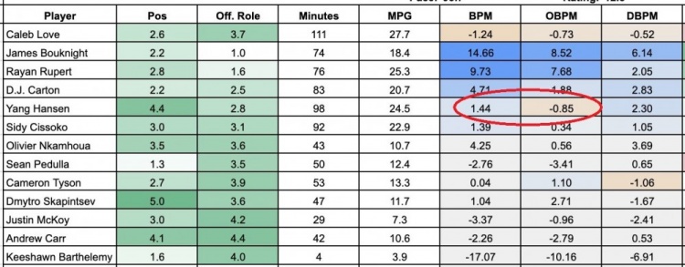 由图可见,杨瀚森BPM(基础正负值)1.44处于全队中游水平,OBPM(进攻正负值)为负数。