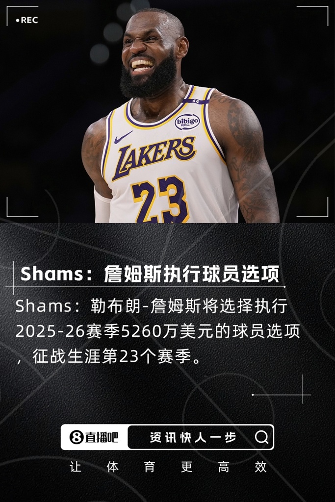 史上征战首个23赛季的球员詹姆斯执行下赛季5260万的球员选项