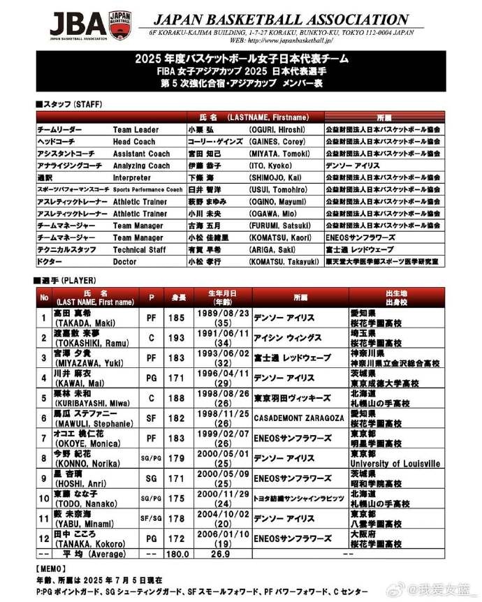 日本女篮今天中午公布了出征女篮亚洲杯的12人大名单。这支队伍平均年龄26.9岁,平均身高1米8,将会是中国女篮卫冕路上的最大障碍。这份名单...