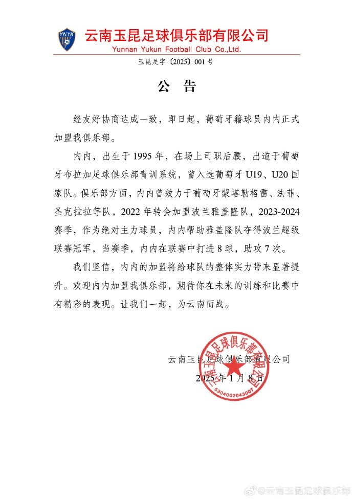 我们坚信,内内的加盟将给球队的整体实力带来显著提升。欢迎内内加盟我俱乐部,期待你在未来的训练和比赛中有精彩的表现。让我们一起为云南而战。