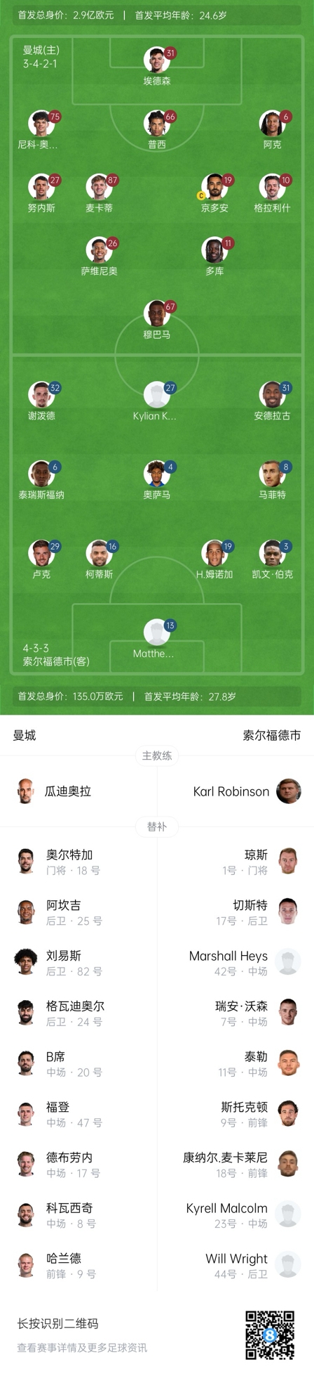 1月12日讯 足总杯第3轮,曼城主场迎战英乙球队索尔福德城,赛前首发名单公布。