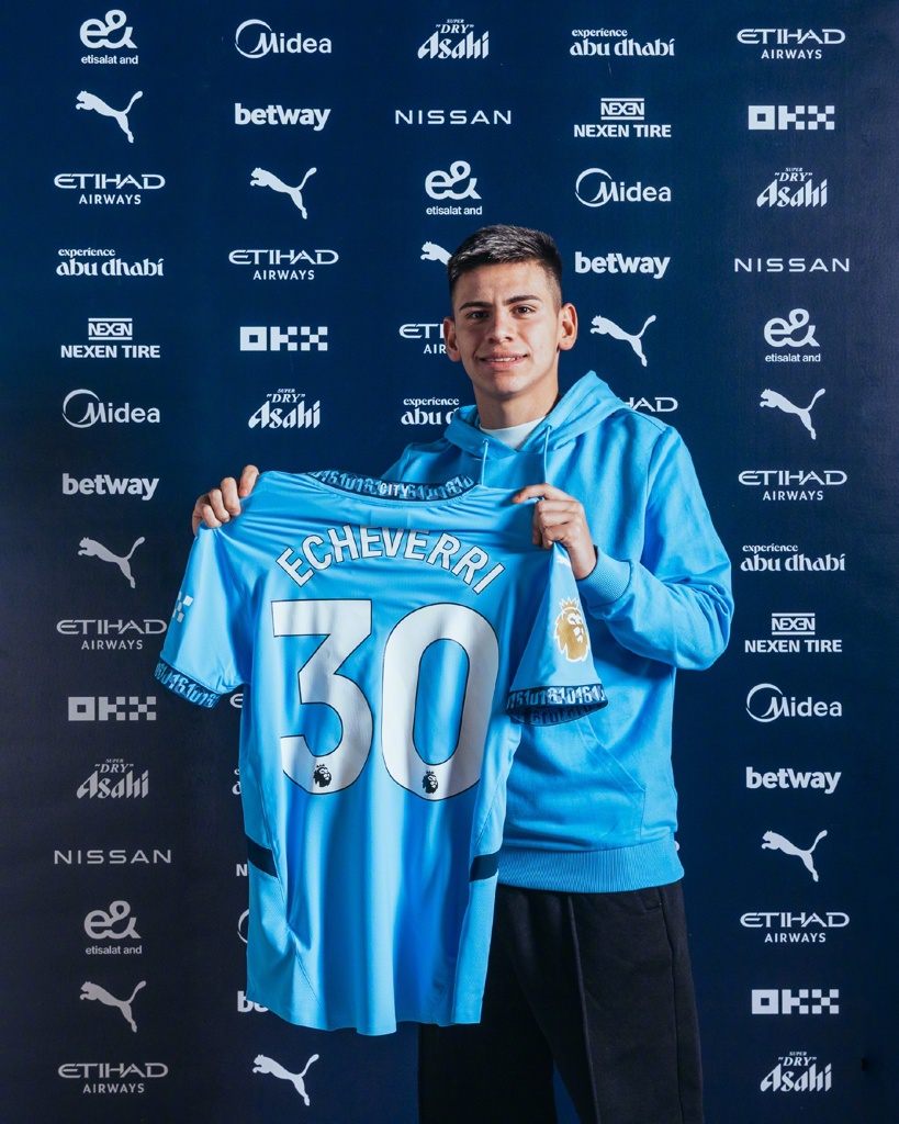 曼城在上个月宣布19岁阿根廷中场埃切维里正式加盟球队,他将身披30号球衣。