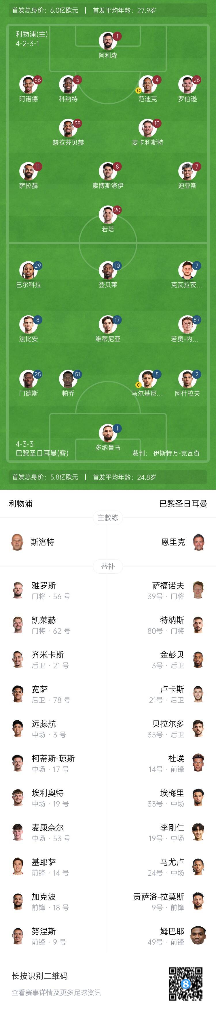 利物浦首发:1-阿利森、66-阿诺德、4-范迪克、5-科纳特、26-罗伯逊、10-麦卡利斯特、38-赫拉芬贝赫、8-索博斯洛伊、7-路易斯-迪亚斯、11-萨拉赫、20-若塔