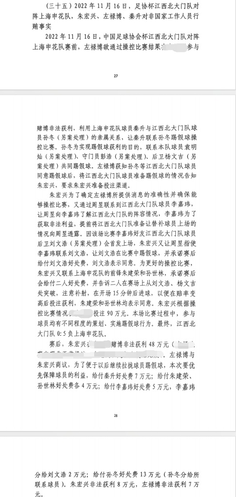 网上流传出足坛“假赌黑”案件的相关判决书,其中包括了2022年足协杯上海申花5-0江西北大门的比赛,两队多达9名球员参与。