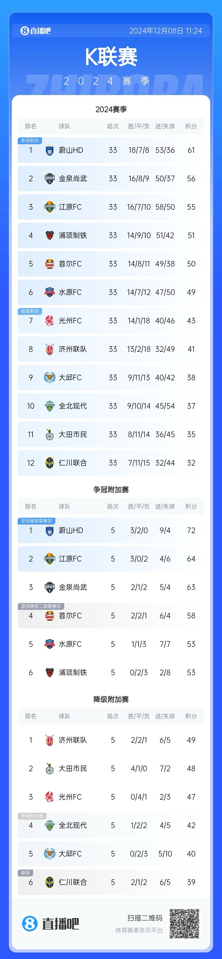 值得一提的是,上赛季,另一支K1联赛豪门球队水原三星不幸降入K2联赛,他们本赛季K2排在积分榜第6位(与第5位同积56分)。