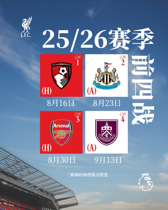 06月18日讯 25/26赛季英超赛程出炉,利物浦揭幕战对手是伯恩茅斯,比赛将于北京时间8月16日周六3:00进行,红军坐镇安菲尔德开启新赛季!第...
