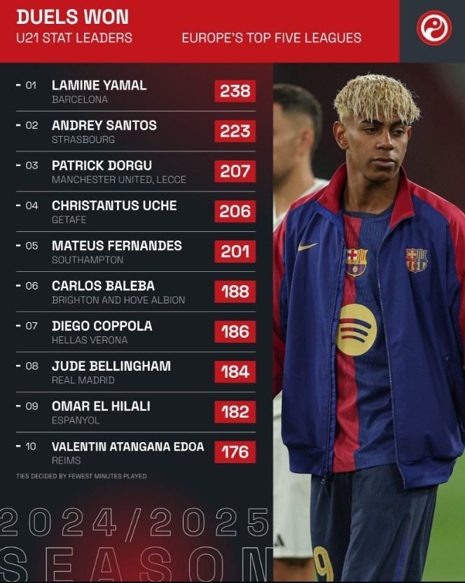 本赛季五大联赛赢得地面对抗次数最多U21球员:亚马尔238次居首