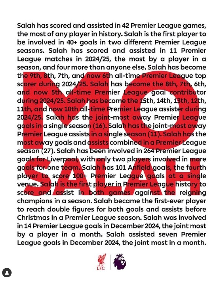 2月25日讯 萨拉赫本赛季英超27场比赛,贡献了25粒进球和16次助攻。英超官方盘点了萨拉赫在本赛季英超过程中创造的的纪录或达成的里程碑时...