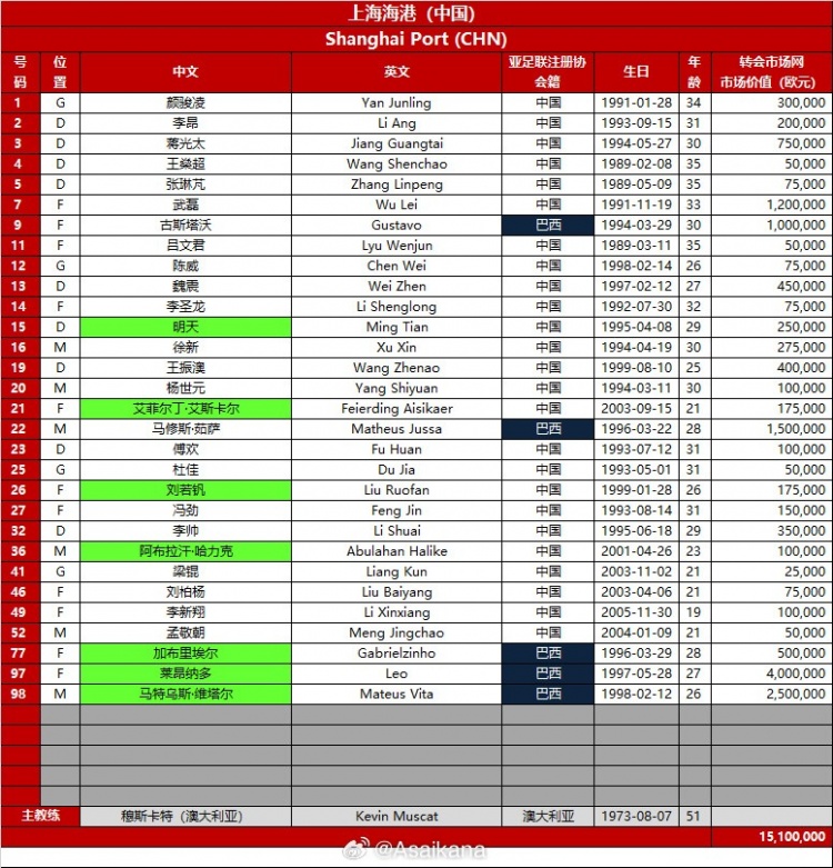 2月4日讯 德转管理员朱艺在社媒公布了上海海港队2024/25赛季亚冠精英联赛报名名单,海港本次报名30人,包括5名外援。朱艺对报名名单进行注...