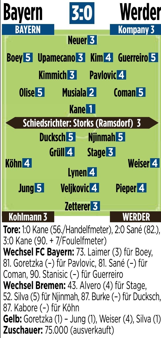 拜仁vs不莱梅图片报评分:凯恩1分最高,穆西亚拉2分&奥利塞5分