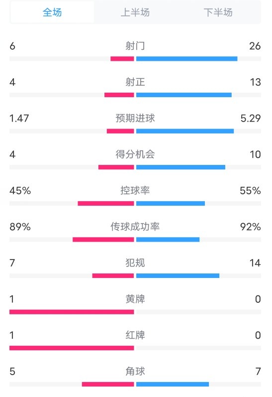 南安普顿1-5切尔西数据:射门6-26,射正4-13,控球率45%-55%