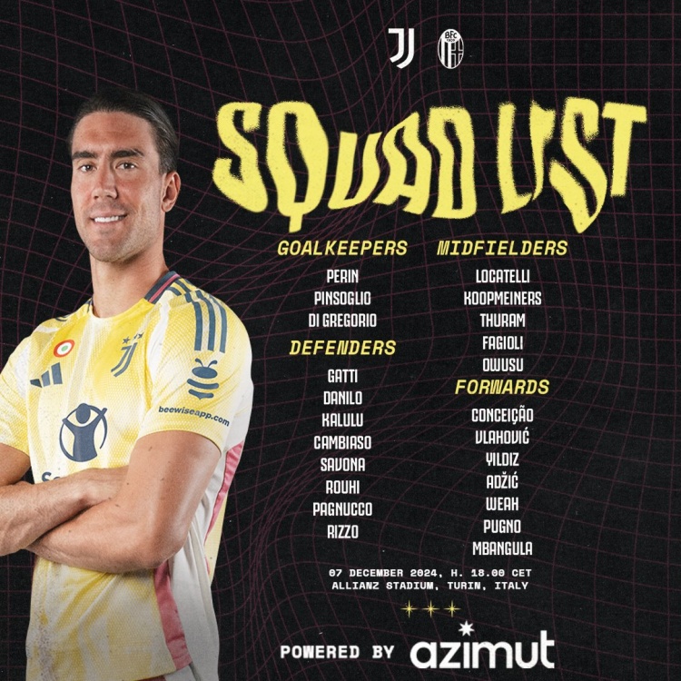 12月7日讯 北京时间明天凌晨1点,尤文将在意甲第15轮比赛中主场对阵博洛尼亚。尤文公布了此役的球员名单,弗拉霍维奇、阿季奇回归,小孔塞...